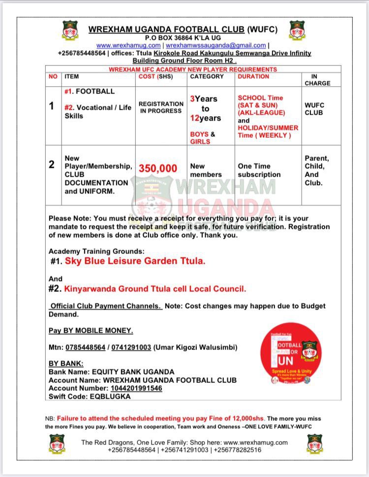 About Wrexham Football Club UgandaWrexham Football Club Uganda Ltd is a charitable Club , not for profit company limited by guarantee in Uganda. Company registration number 80020003716192.An... Read More